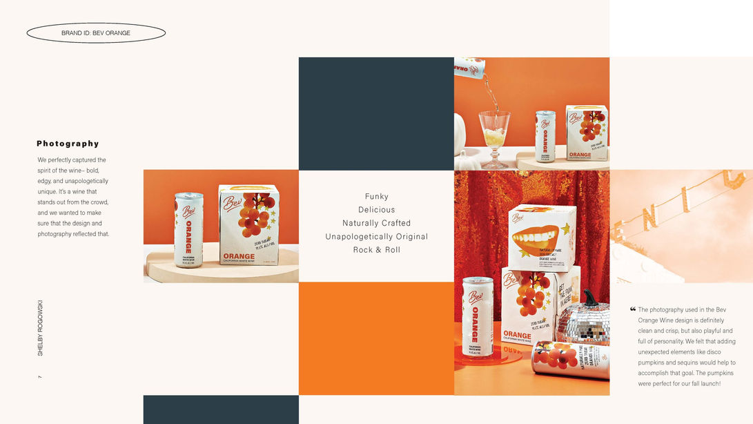 The packaging design used organic elements, bold typography inspired by the punk movement, and pops of orange to capture attention on shelves. For the fall product shoot, we utilized playful sequins, tactile textures, and bold orange tones to create a visually striking campaign. Each element reinforced the premium and modern feel of the Bev brand while celebrating the distinctive characteristics of orange wine. The campaign was designed to connect with Bev’s audience through digital channels and social media activations.